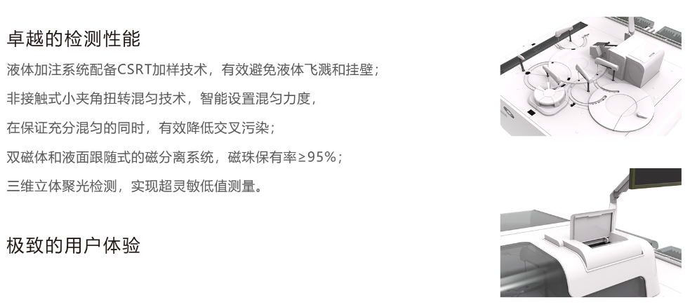 液體加注系統(tǒng)配備CSRT加樣技術(shù),有效避免液體飛濺和掛壁;非接觸式小夾角扭轉(zhuǎn)混勻技術(shù),智能設(shè)置混勻力度在保證充分混勻的同時(shí),有效降低交叉污染雙磁體和液面跟隨式的磁分離系統(tǒng),磁珠保有率295%;三維立體聚光檢測,實(shí)現(xiàn)超靈敏低值測量